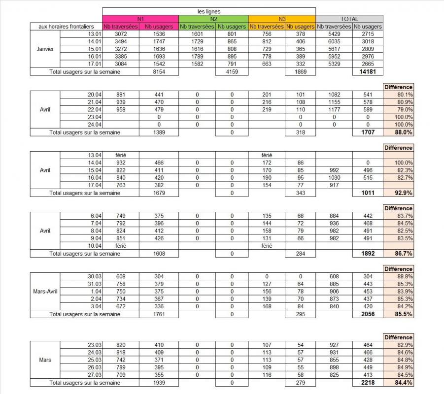 La SCTL a demandé un état de la situation de la fréquentation des lignes N1, N2 et N3 au regard des mesures qui ont été prises sur la Suisse et la France dans le cadre de la pandémie Covid-19.